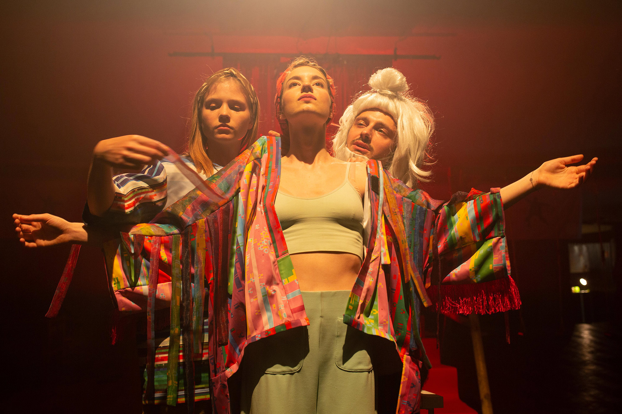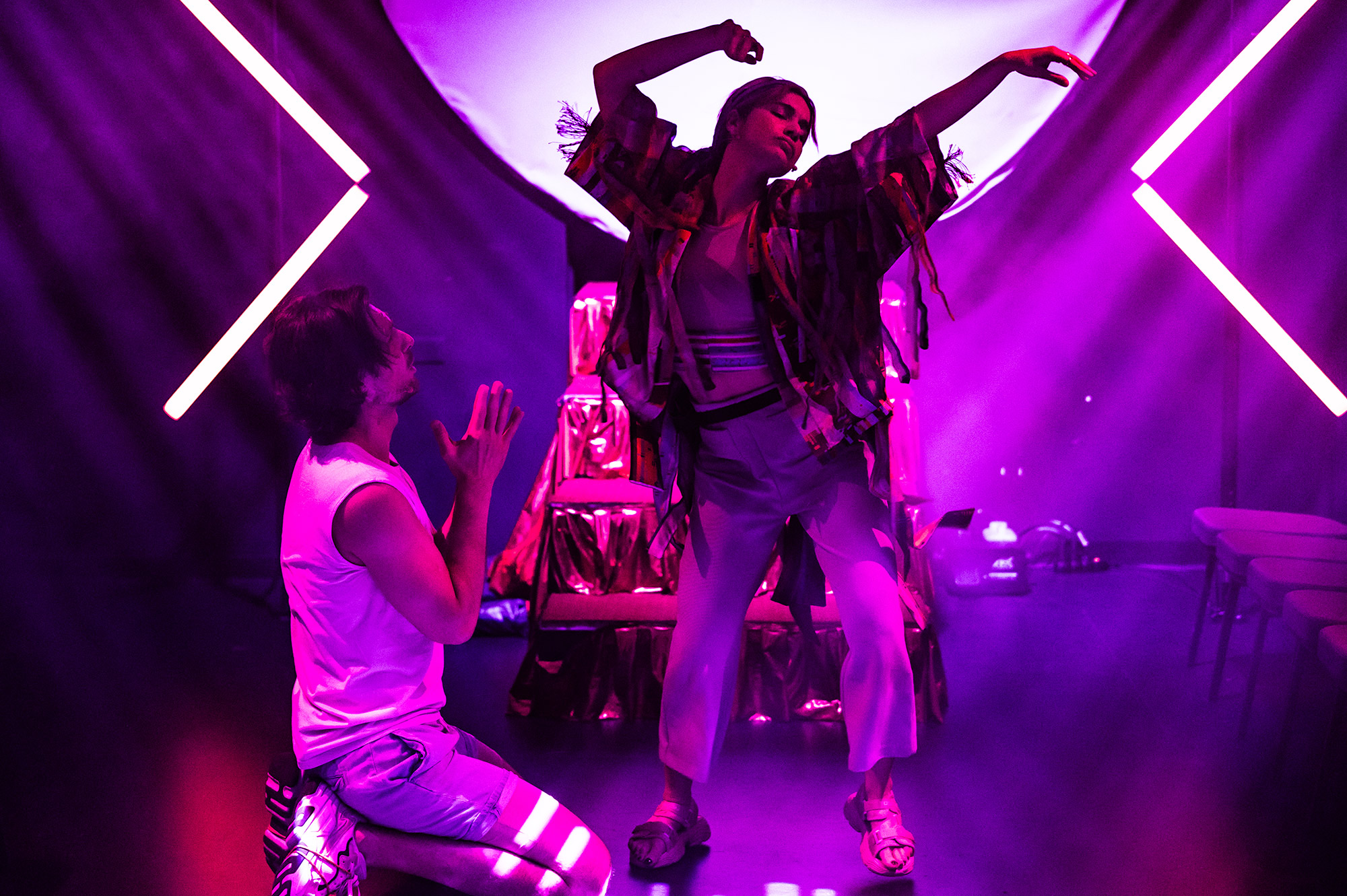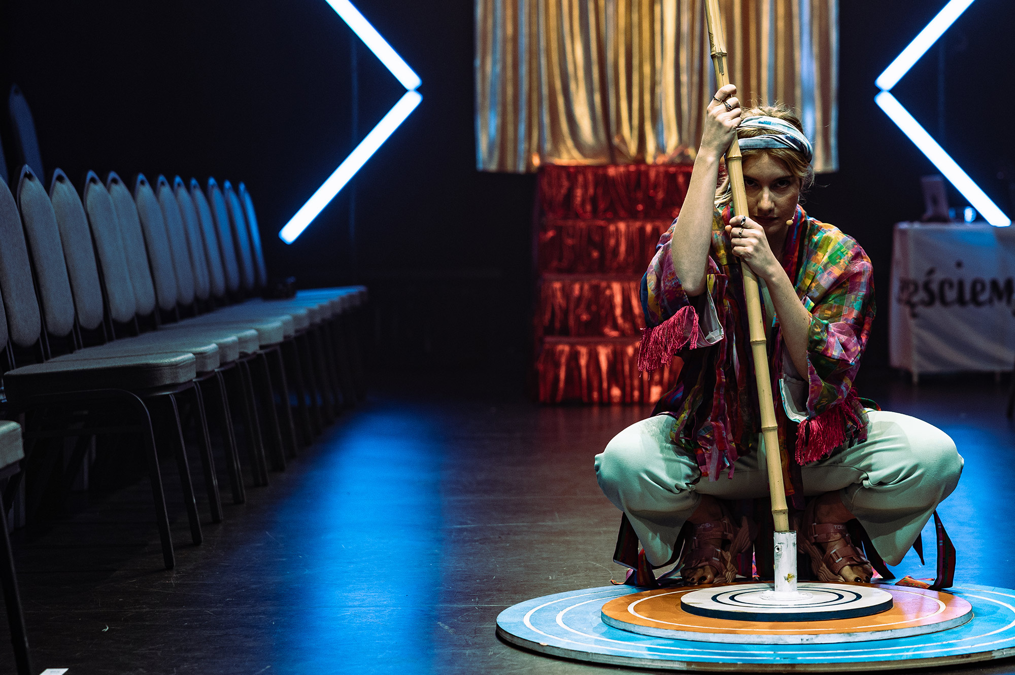 W spektaklu wykorzystane jest światło stroboskopowe.
