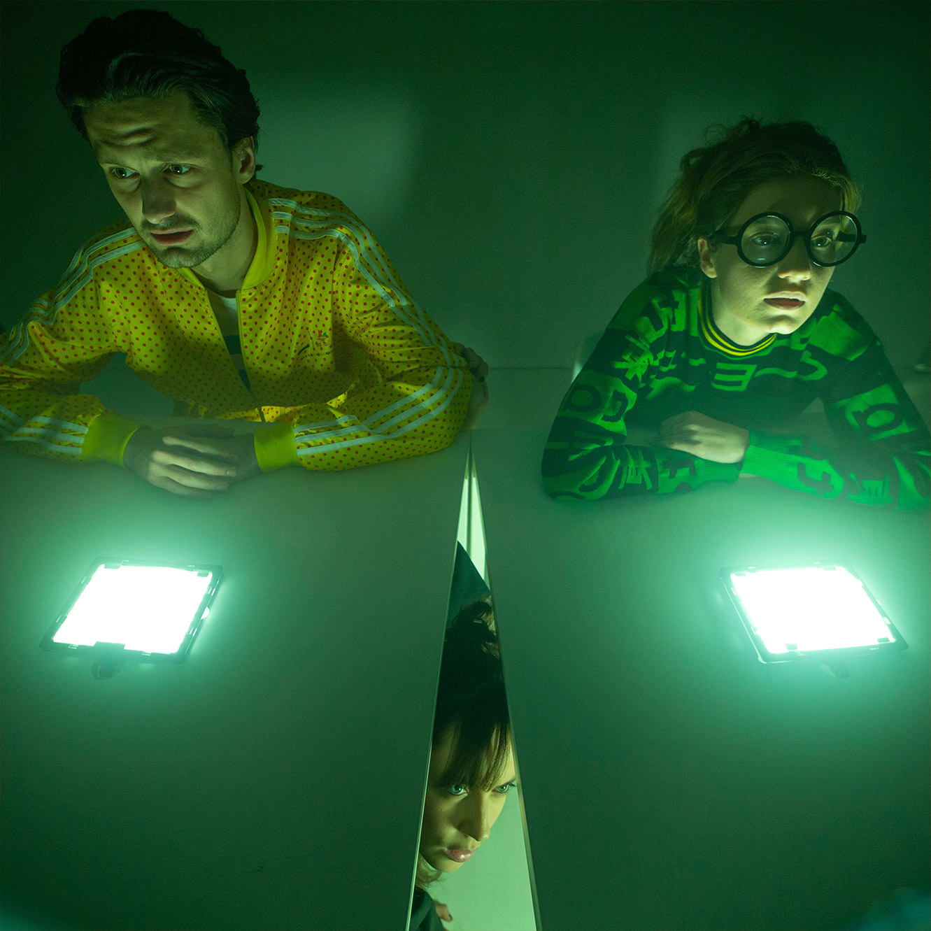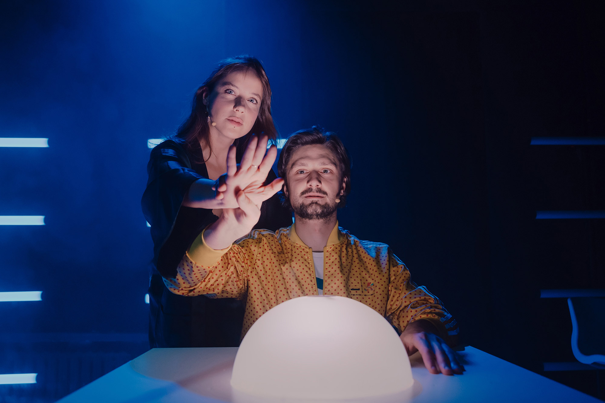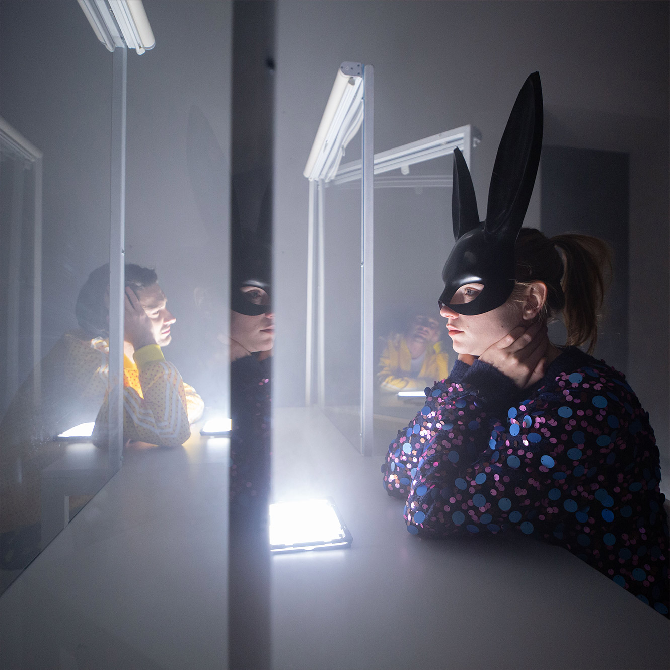 W spektaklu wykorzystane jest światło stroboskopowe.