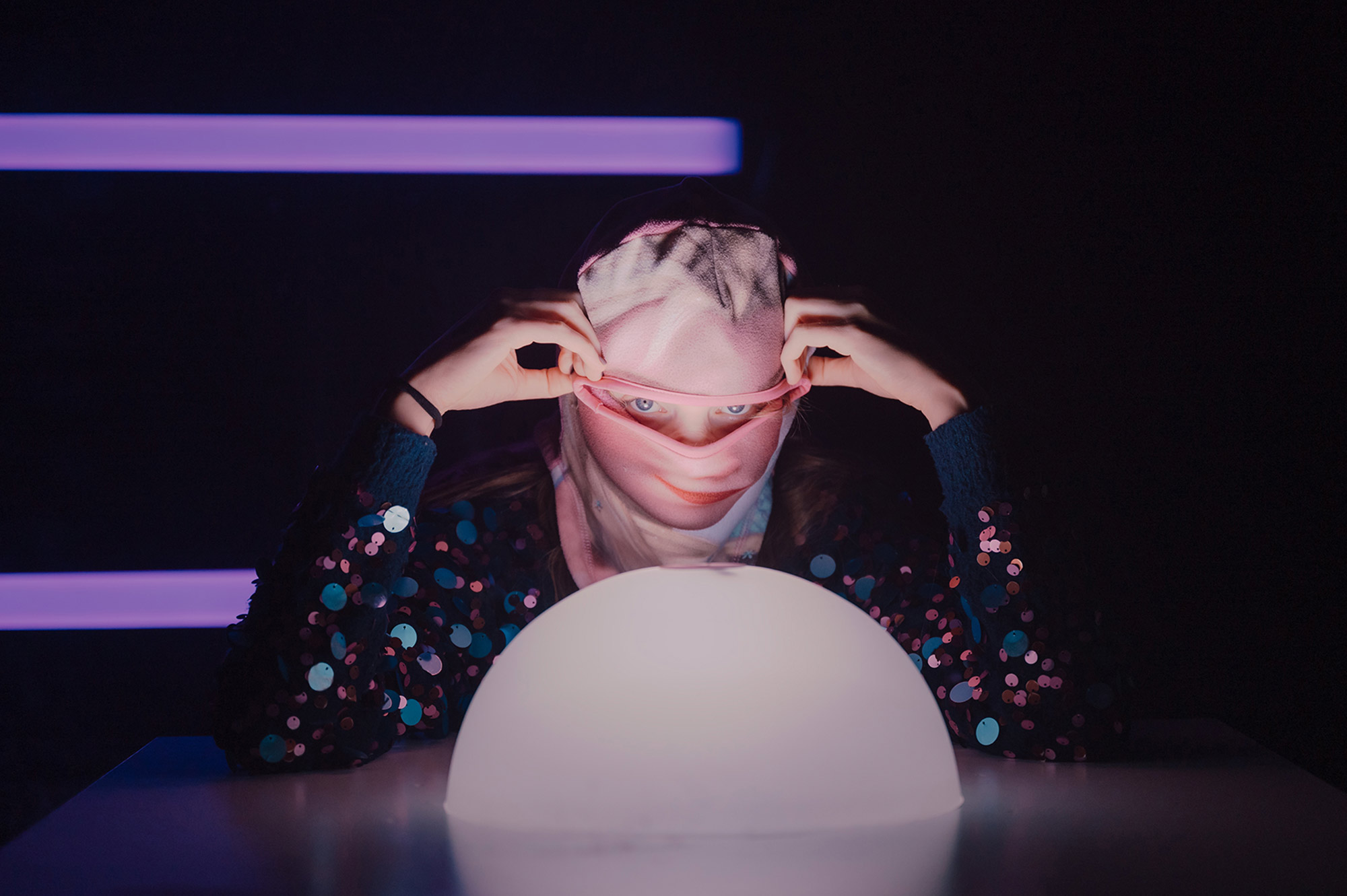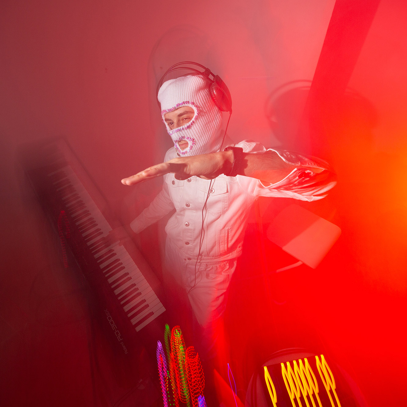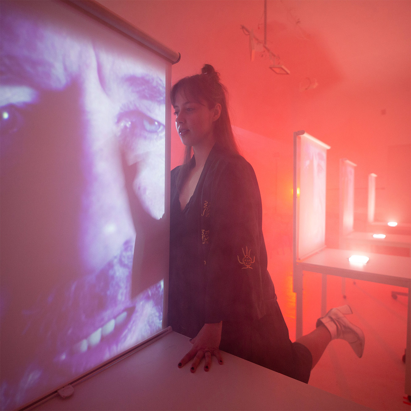 W spektaklu wykorzystane jest światło stroboskopowe.